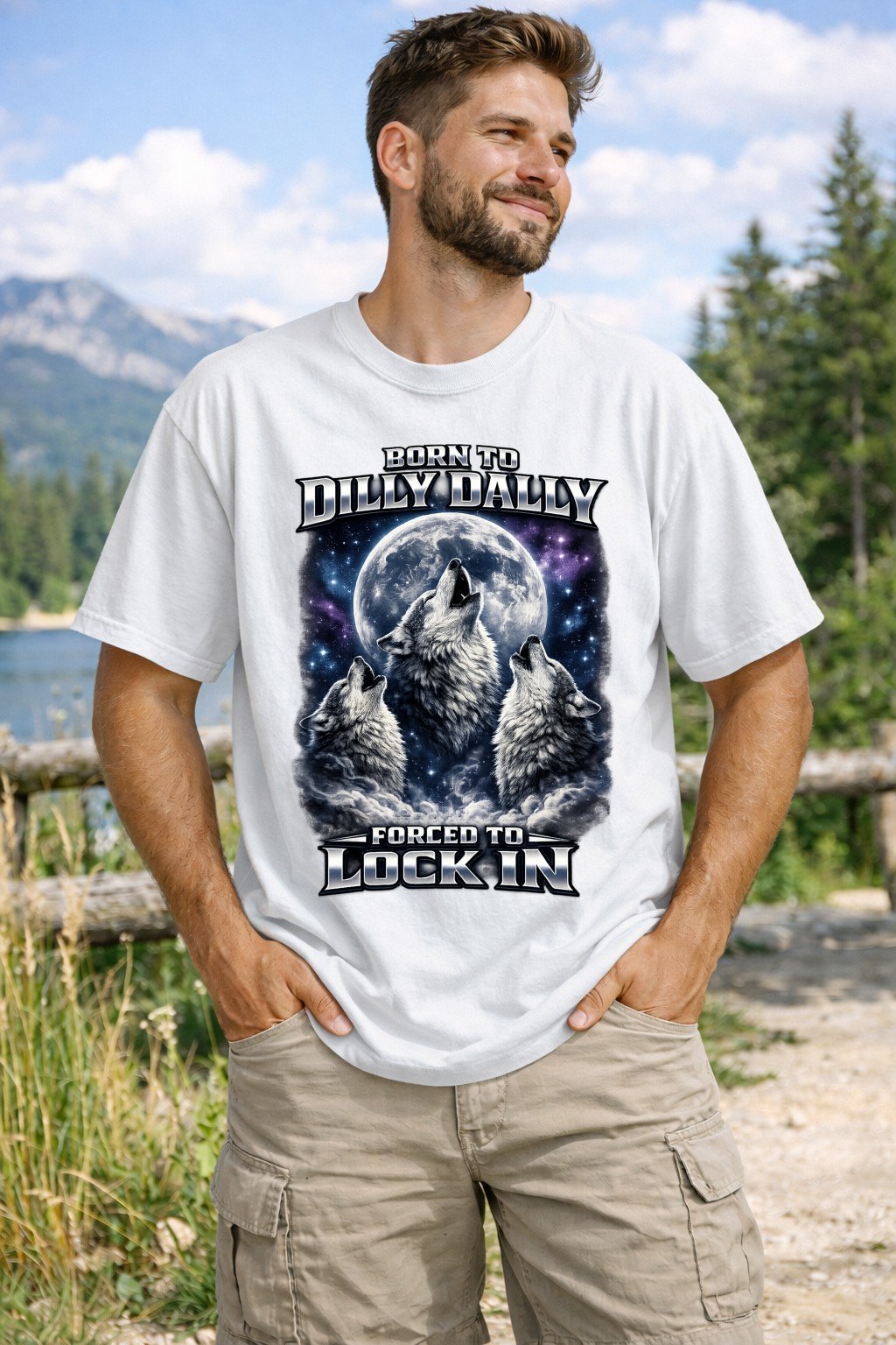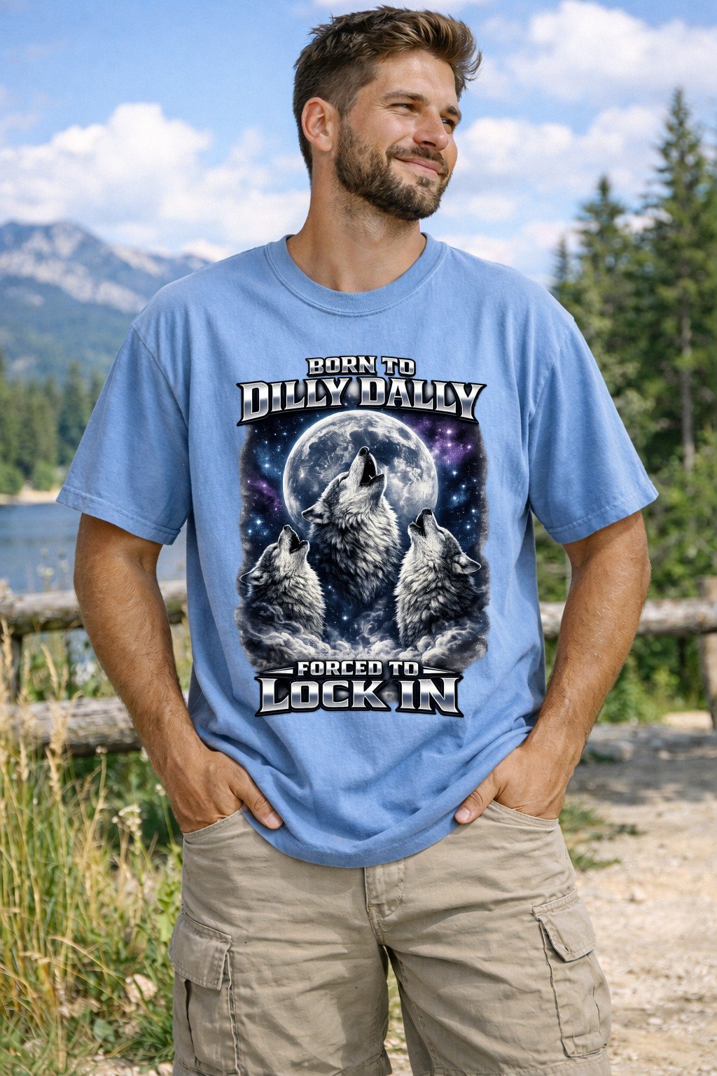 Stop dilly dallying and lock in with the ultimate ironic streetwear staple. This Comfort Colors 1717 tee features a majestic retro wolf trio, perfect for those who were born to procrastinate but forced to perform.